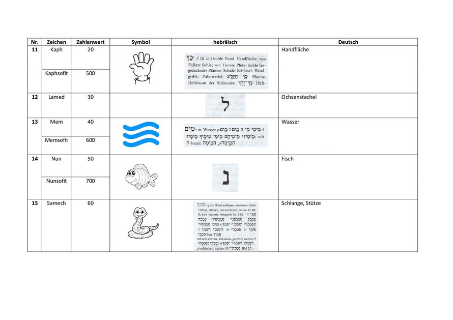 Die 22 hebräischen Buchstaben, ihre Zahlenwerte und Symbolzuordnungen